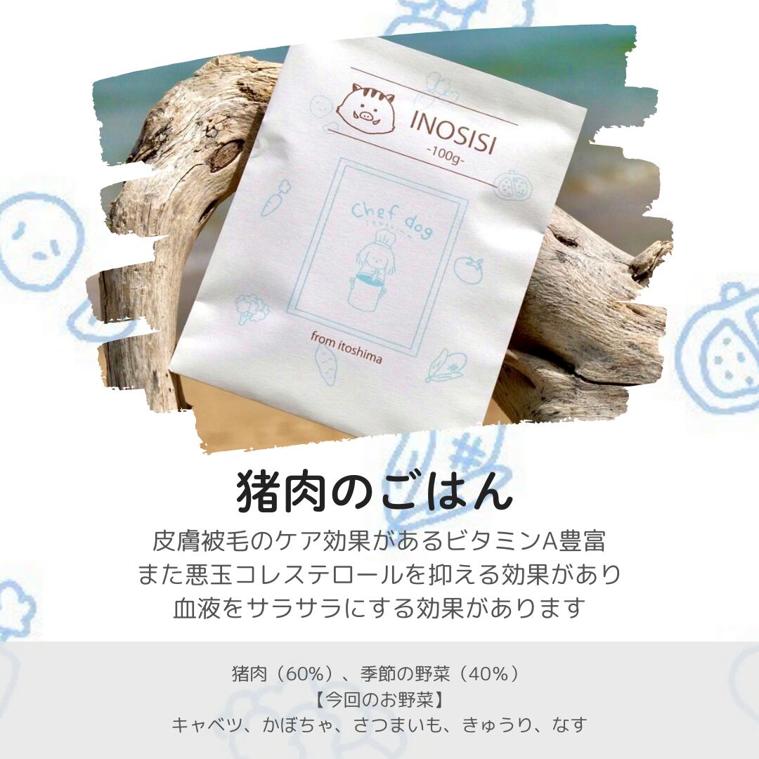猪肉赤身(60%)、季節の野菜(40%)(キャベツ、かぼちゃ、さつまいも、きゅうり、なす)
