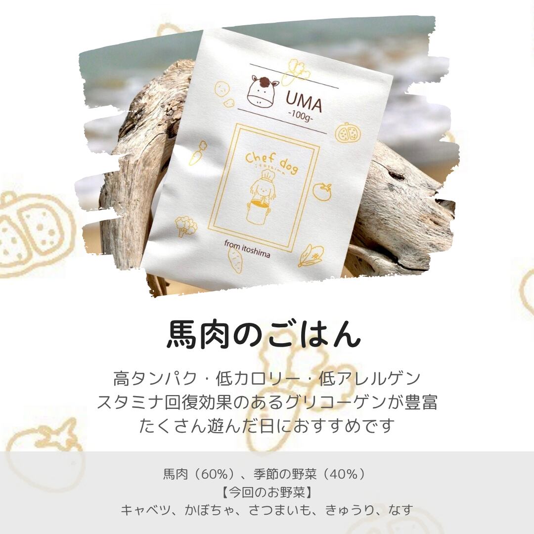 馬肉赤身(60%)、季節の野菜(40%)(キャベツ、かぼちゃ、さつまいも、きゅうり、なす)
