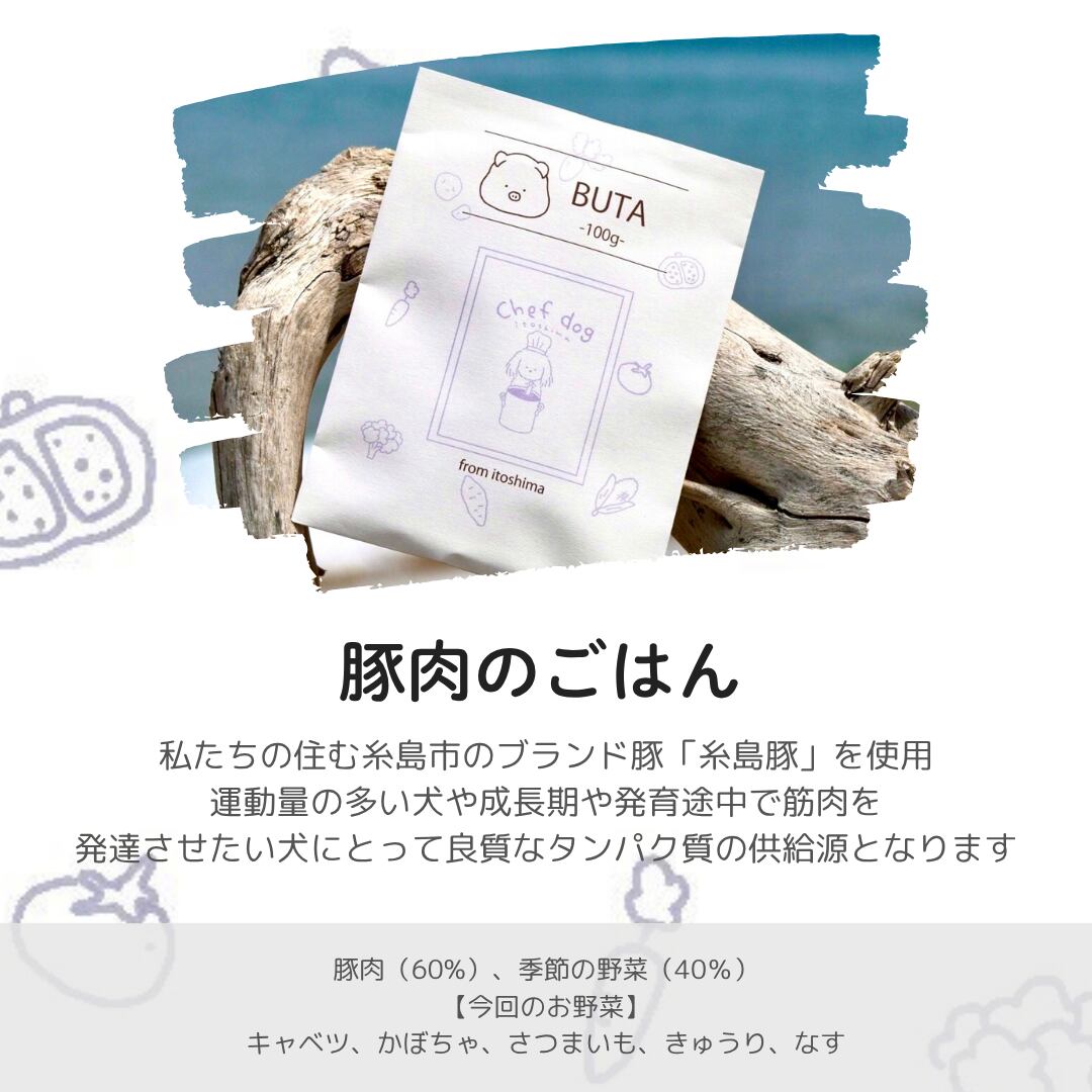 豚肉赤身(60%)、季節の野菜(40%)(キャベツ、かぼちゃ、さつまいも、きゅうり、なす)