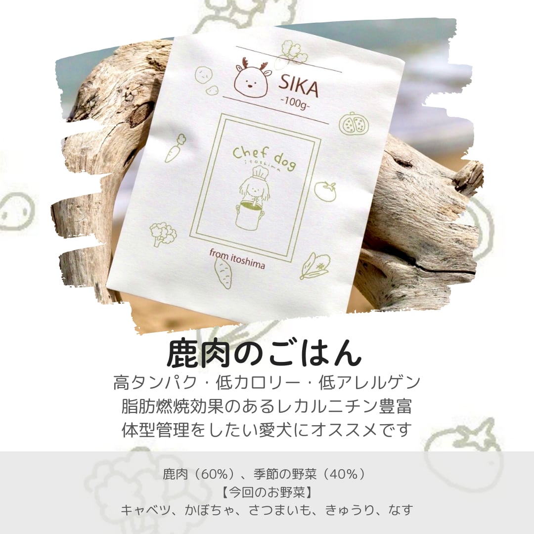 鹿肉赤身(60%)、季節の野菜(40%)(キャベツ、かぼちゃ、さつまいも、きゅうり、なす)
